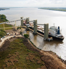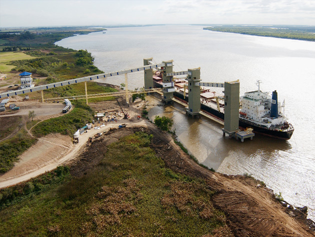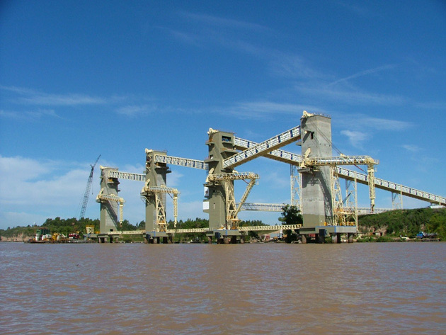 A complete harbor was built over the Paraná River: 4 loading towers, 4 berthing dolphins, 2 mooring towers and the pathways connecting the main tower with the 4 loading towers. The work was completed with footbridges, bridge piles, conveyor belt and shiploader assembly and the loading and transfer rack assembly. The entire work added up to 10,000 m3 of concrete and 1,800 t of steel. The loading towers were built with a concrete slide system.