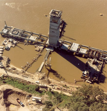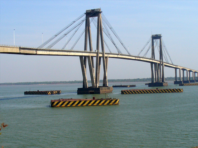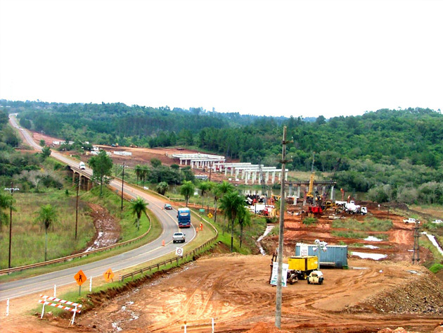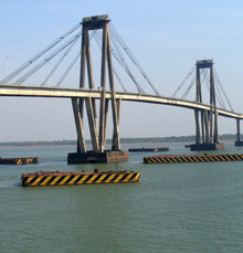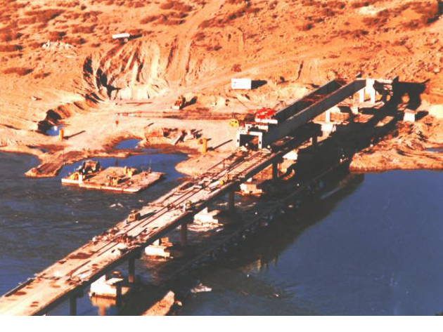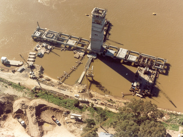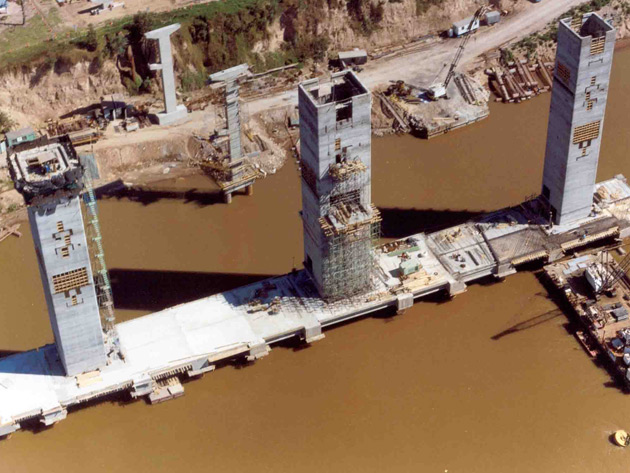 It is a road and railroad bridge over the Paraná River joining the cities of Posadas (Argentina) and Encarnación (Paraguay). The project involved building the land access section (296m), the side viaducts (1,980m), the main bridge (570m), the west railroad access (730m), the border station, the railroad (2,650m) and the additional facilities (lighting system, river buoys, airway beacons, etc.). In total, 27,000m3 of concrete slab, 31,000m3 of post-stressed concrete and 6,900t of steel were used.