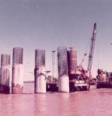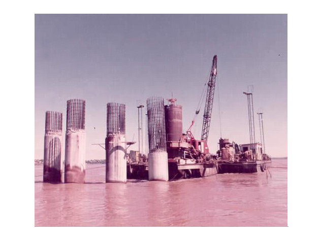 All river and land foundations for said bridge were built. A total of 185 piles were fit with basaltic rock.